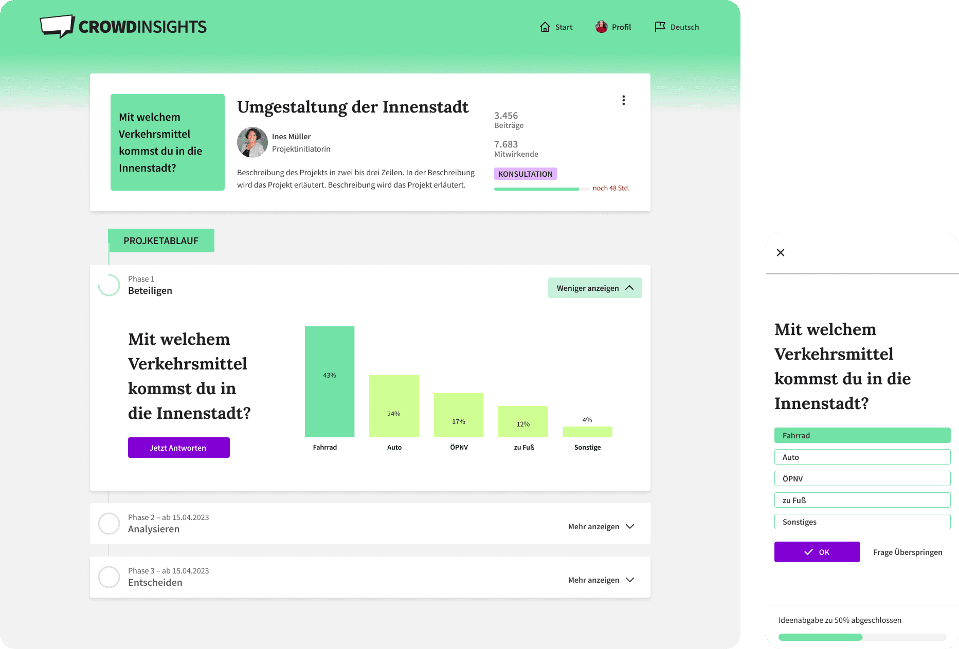Die CrowdInsights-Plattform ist die ideale Infrastruktur für entscheidungsorientierte Partizipation und Co-Creation. Die Software unterstützt Sie dabei, zielgerichtet zu beteiligen, neue Erkenntnisse zu gewinnen und jedem Beteiligten eine individuelle Rückmeldung zu geben.